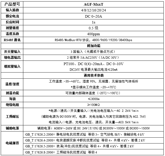简要描述: AGF-T 穿孔式光伏汇流采集装置是门应用于智能光伏汇流箱,用于监测光电池阵列中电池板运行状态,组串电流测量,汇流箱中防雷器状态采集、直流断路器状态采集、装置带有 RS485 接口可以把测量和采集到的数据和设备状态上传。